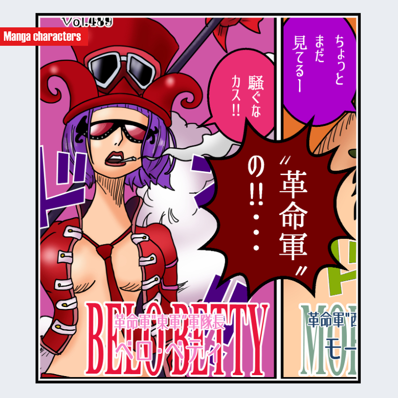 『ONE PIECE』に登場するベロ・ベティは、紫色の短髪を持つ女性キャラクターである。髪型は前髪を大きく分けたショートボブ構造で、毛先が外側に流れる形となっている。衣装は赤を基調とした軍服風デザインで、胸元が大きく開いたジャケットと手袋が特徴的な「革命軍装型」に分類される。肩部から腕にかけての衣装ラインが直線的で、全体として威圧感と指導者的シルエットを意識した構造を有する。装飾要素は少なく、色彩対比によって存在感を強調している。