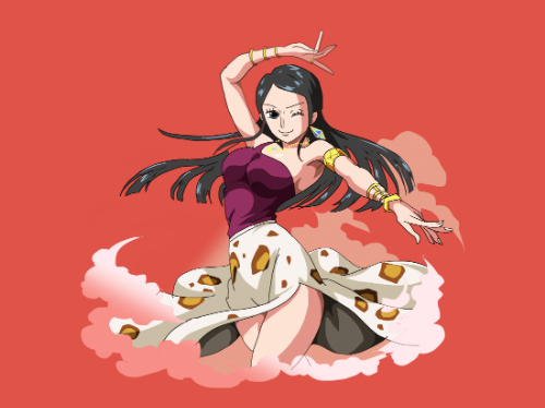 『ONE PIECE』に登場するニコ・ロビンは、長い黒髪と細身の体躯を持つ女性キャラクターである。画像では、濃紺のショートジャケットに加え、腹部が露出したトップスとピンク系の腰巻きを組み合わせている。腕が複数伸びている描写が見られ、これは彼女の能力を象徴する「多肢展開型」の視覚構造を示す。サングラスを頭部に装着し、全体的に南国調の衣装構成と曲線的なポージングが強調されている。
