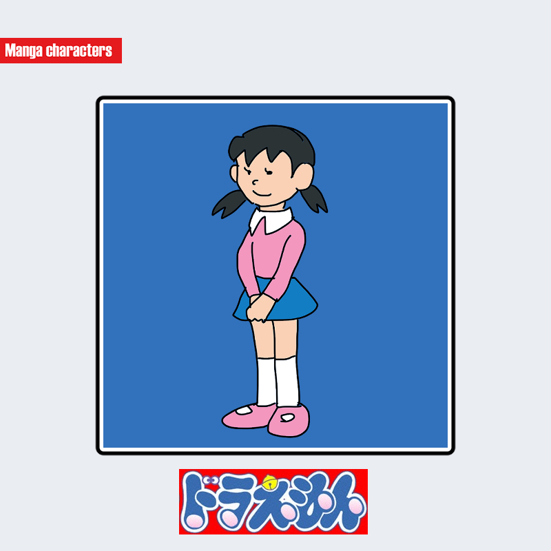 『ドラえもん』に登場する源静香(しずかちゃん)は、黒髪を肩まで伸ばしたストレートヘアに、左右で結んだ小さなツインテールを持つキャラクターである。髪型は後頭部を中心に対称構造をとり、丸みのある前髪が顔全体を柔らかく囲んでいる。衣装はピンクの長袖トップスに青いスカートを合わせた「日常服融合型」構造で、シンプルながらも明確な色分けが施されている。全体として、直線と曲線が均衡した安定的デザインとなっている。