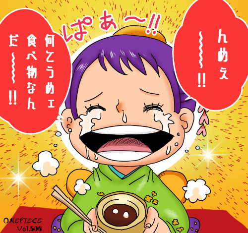 『ONE PIECE』に登場するお玉は、紫色の髪を頭頂部でまとめた団子状の結い上げを特徴とする少女キャラクターである。髪留めには花を模した装飾が付けられており、年少キャラ特有の可動性の高いシルエットを形成している。衣装は緑を基調とした「和装融合型」構造で、短い丈の着物に黄色の帯を結び、袖や裾にはパッチワーク風の補修跡が見られる。伝統的な意匠と子どもらしい軽装の両立がデザイン上の特徴である。