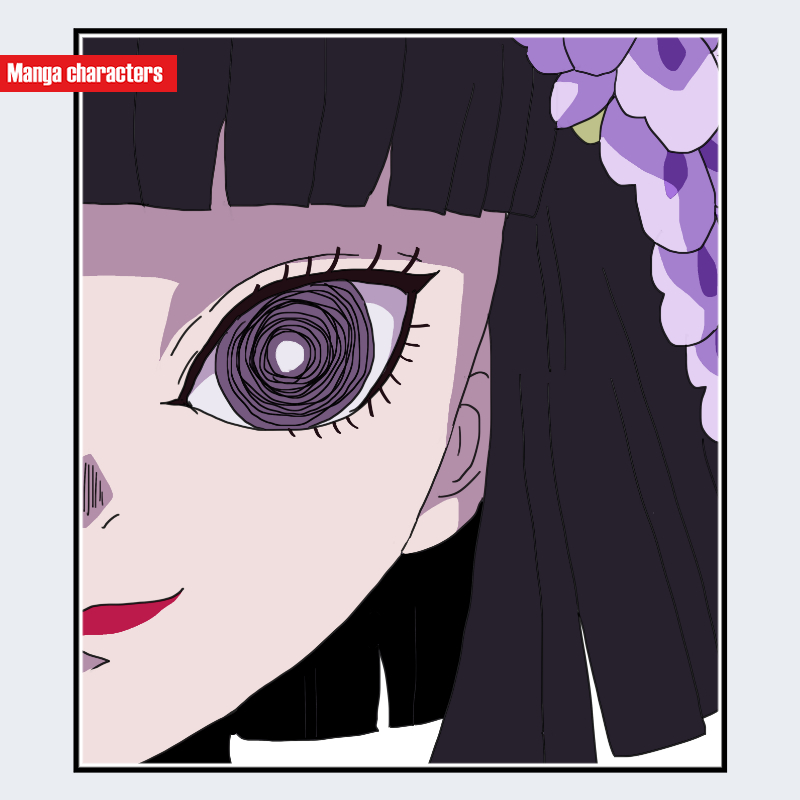 『鬼滅の刃』に登場する黒髪(くろかみ)は、整えられた前髪と真っ直ぐに落ちる黒髪を持つ女性キャラクターである。髪は光沢のある直線構造で、左右対称に整えられたボブ状のフォルムを形成している。瞳は大きく円形で、内部に渦状の文様を描く独特の虹彩構造を持ち、「幻視融合型」デザインに分類される。衣装は紫系統の和装で、花柄模様と髪飾りの組み合わせが特徴的であり、花弁状の装飾が顔の側面にアクセントを与えている。