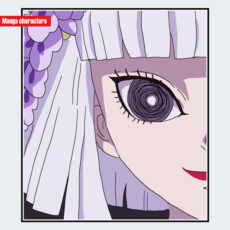 『鬼滅の刃』に登場する白髪(しろかみ)は、純白の髪と幾何的に整えられた前髪を持つ女性キャラクターである。髪は直線的に切り揃えられ、全体として対称的なシルエットを形成している。瞳は渦巻き状の虹彩を持ち、黒髪と対となる「幻視融合型」構造として設計されている。衣装は紫を基調とした和装構造で、花柄の意匠と髪飾りの紫陽花が視覚的な統一性を生み出している。全体として装飾と造形の均整が重視された構成である。