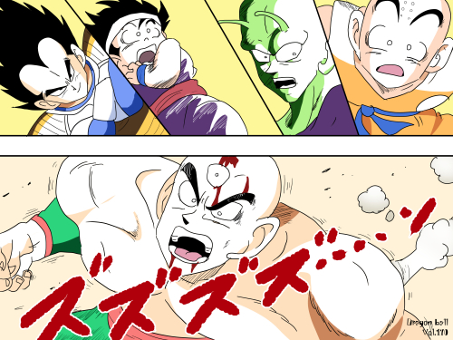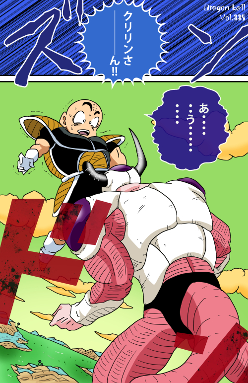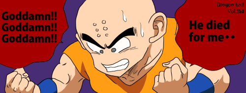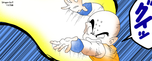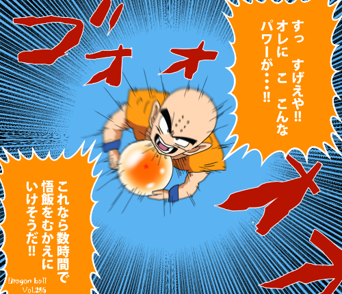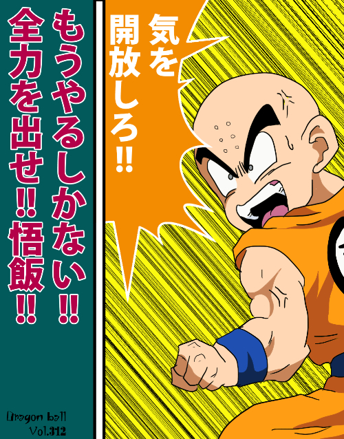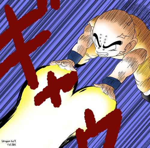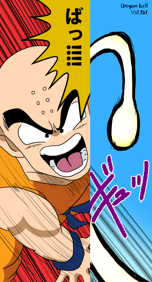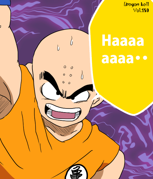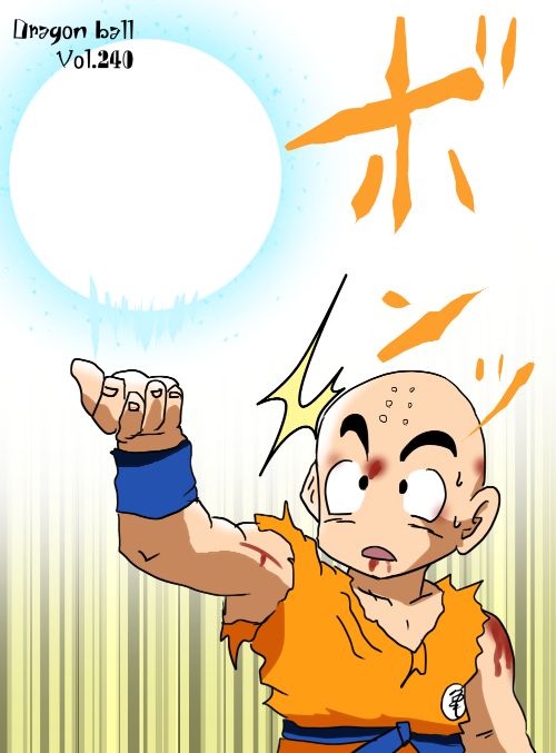 『ドラゴンボール』に登場するクリリンは、丸みのある頭部に特徴的な点状の痕が配置された外見を持つ。画像では上半身が視認でき、道着は橙色主体で肩幅が広く、袖の短い武道着構造である。腕周りは筋肉線が強調され、体格は小柄ながら引き締まった造形。手前には球体状のエネルギー演出が描かれているが、視認情報としては掌を前に突き出す姿勢が確認できる。同作の他キャラと比較すると、頭部のシルエットがすぐに識別可能な「簡略化頭部造形型」に属する。