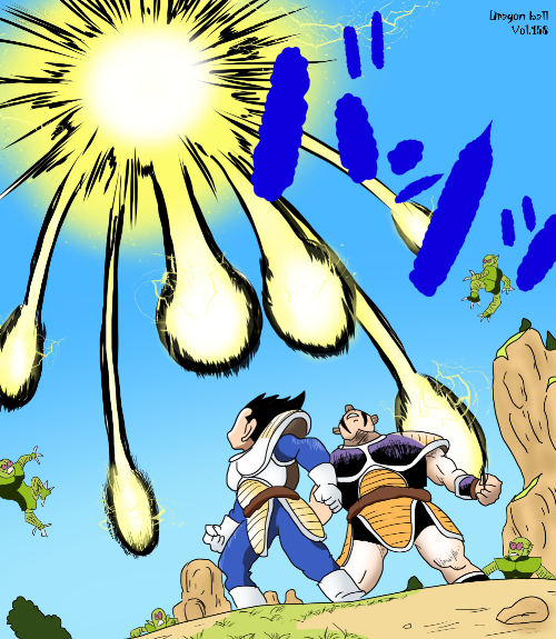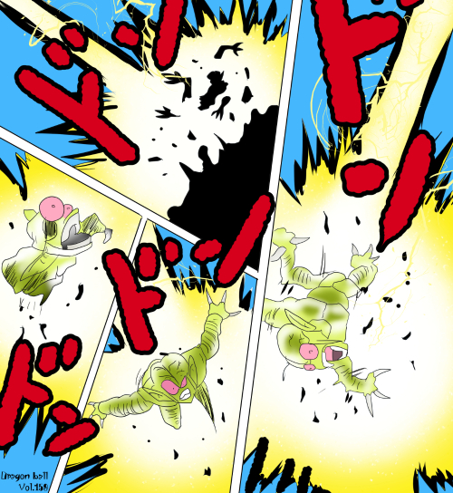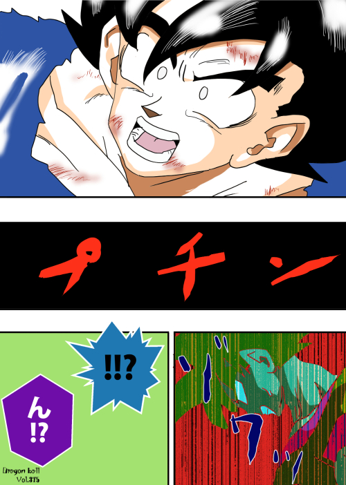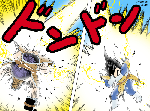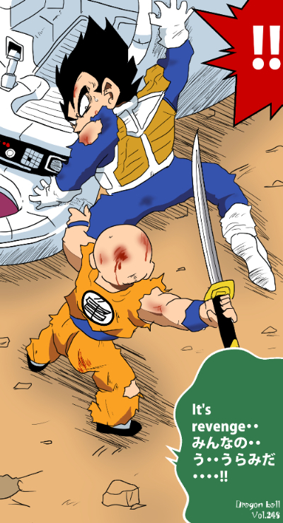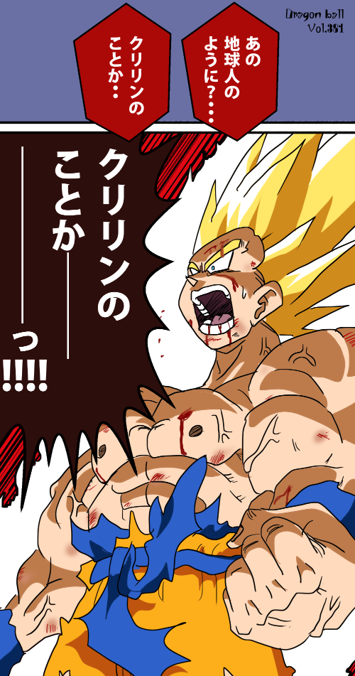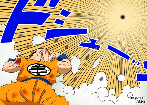 頭部の点状痕は“dots” や “marks” など直訳すると意味が変わる可能性があり、文化的背景を知らない読者は誤読しやすい点に注意する。橙色の道着は “orange martial-arts uniform” と補足的に記述すると意図が伝わりやすい。エネルギー球の描写は比喩的に理解されることが多いため、構造物として扱わず視覚要素として説明するのが適切。