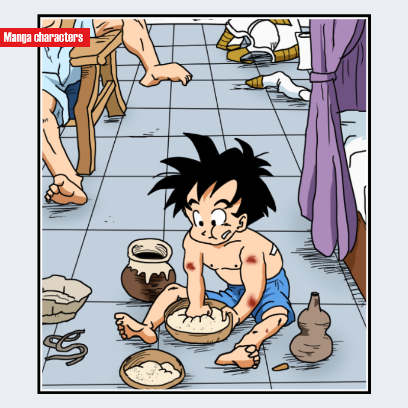 『ドラゴンボール』に登場する孫悟飯は、小柄な体格と大きく広がる黒髪が特徴で、毛先が複数方向へ跳ねる幼年期特有のシルエットが確認できる。上半身は裸で、腕や膝に擦り傷のような赤い汚れが付着しており、下半身は青系の短パンを着用している。足元は素足で、全体として簡素な衣服構造となっている。シリーズ他キャラと比較すると、幼年体型と髪型の特徴から「幼年人物造形型」に分類できる。