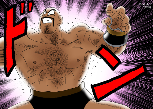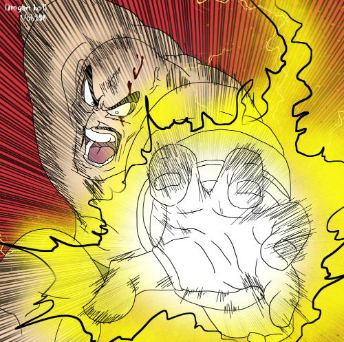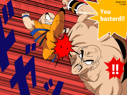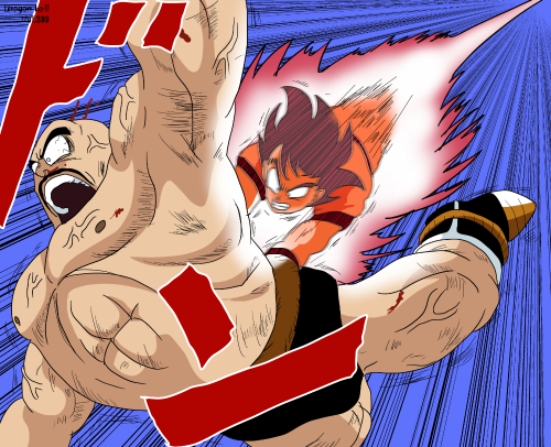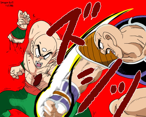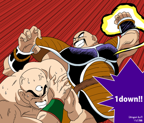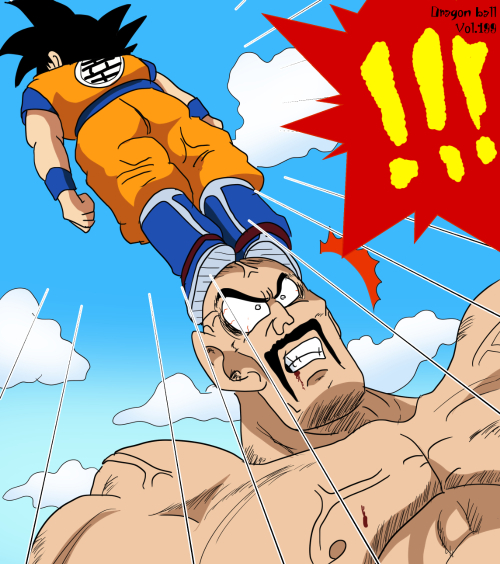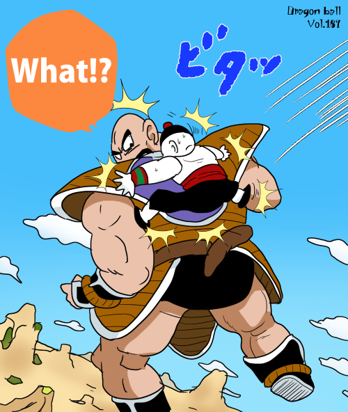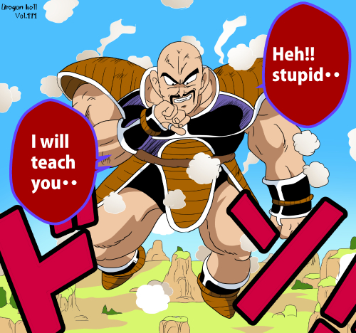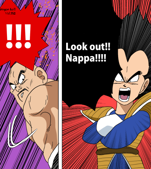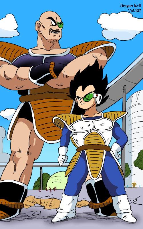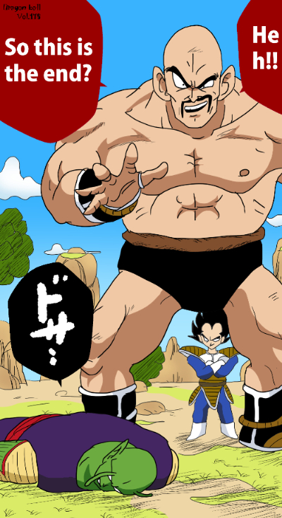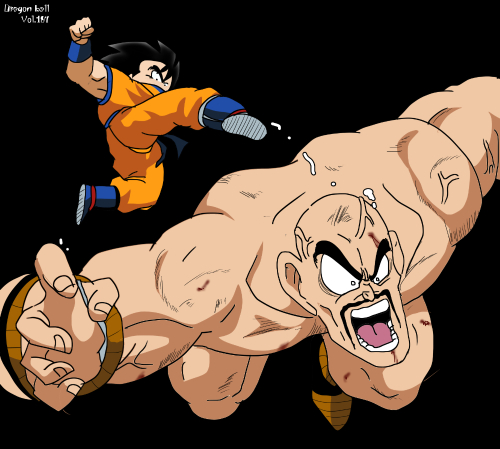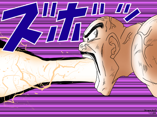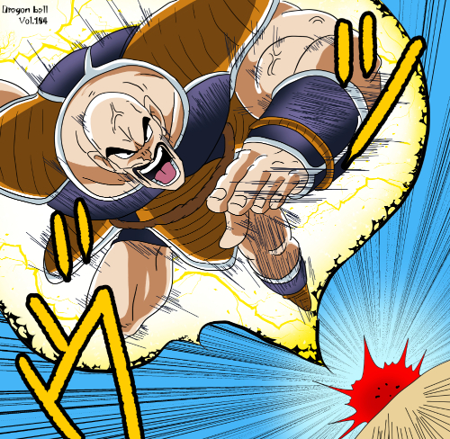 『ドラゴンボール』に登場するナッパは、剃り上げた頭部と厚い眉を持つ強い輪郭の造形が特徴である。画像では上半身が視認でき、肩から胸部にかけて層構造を持つ戦闘服のアーマー上部が確認できる。腕は太く、前方に大きく手を突き出した姿勢が描かれている。周囲を取り巻く線状の炎のような輪郭は背景演出であり、外見パーツではない。シリーズ内では同種族の戦士に見られる「戦闘装甲型」の典型的構造を示す。