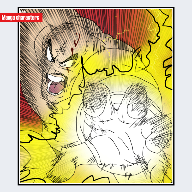 『ドラゴンボール』に登場するナッパは、剃り上げた頭部と厚い眉を持つ強い輪郭の造形が特徴である。画像では上半身が視認でき、肩から胸部にかけて層構造を持つ戦闘服のアーマー上部が確認できる。腕は太く、前方に大きく手を突き出した姿勢が描かれている。周囲を取り巻く線状の炎のような輪郭は背景演出であり、外見パーツではない。シリーズ内では同種族の戦士に見られる「戦闘装甲型」の典型的構造を示す。