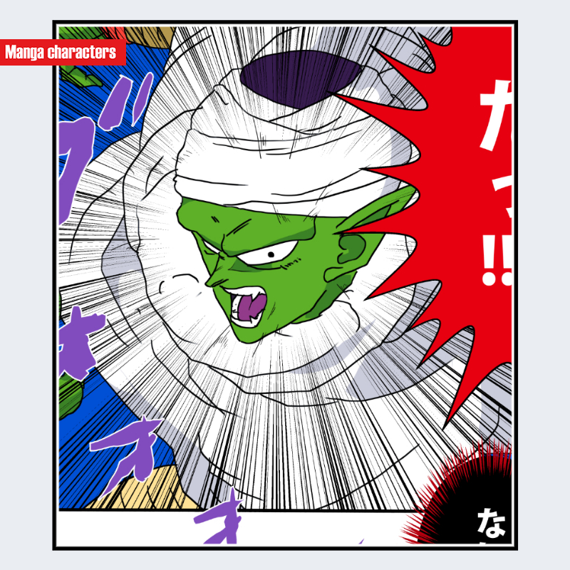 『ドラゴンボール』に登場するピッコロ(マジュニア)は、緑色の皮膚と角張った頬骨が強調された頭部造形を持ち、額から頭頂部にかけて白いターバン状の布を巻いている。画像では上半身が視認され、肩から胸部にかけて大きく波打つ白いマントの襟が層状に広がっている。口は鋭角的な形状で開かれ、耳は横に張り出したナメック星人特有の構造である。同作品内の他キャラクターと比較しても、「外装布装飾型」の特徴を最も強く示す造形となっている。