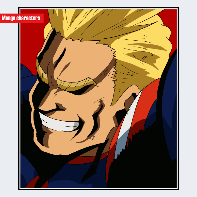 『僕のヒーローアカデミア』に登場するオールマイトは、縦に大きく裂けたような目元と、太い眉、金髪を後方に大きく束ねた特徴的な髪型を持つ。顔の輪郭は角張っており、頬から顎にかけての影が強調される造形となっている。衣装は上半身の一部が視認でき、赤・青・白のヒーロースーツ構造が確認できる。筋肉量の多い体格と直線的な輪郭が組み合わさった「ヒーロースーツ構造」を示す。