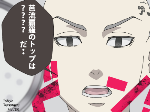 『東京リベンジャーズ』に登場する龍宮寺堅(ドラケン)は、側頭部を大きく刈り上げた髪型と、頭頂部から後方へ流れる長い三つ編み状の束が特徴的である。側頭部には黒いライン状の図案が入っており、刈り上げ部分の形状を強調する装飾的処理が施されている。耳には円形のピアスが装着され、側面からの描写で金属光沢を持つパーツが視認できる。上半身の衣装は暗色で、襟元のみが僅かに確認できる程度の簡略構造であり、髪型の造形を中心とした「装飾強調型」に分類される。同作の希咲鉄太の無装飾型頭部と比べ、龍宮寺は髪形・装飾の要素密度が高い設計となっている。