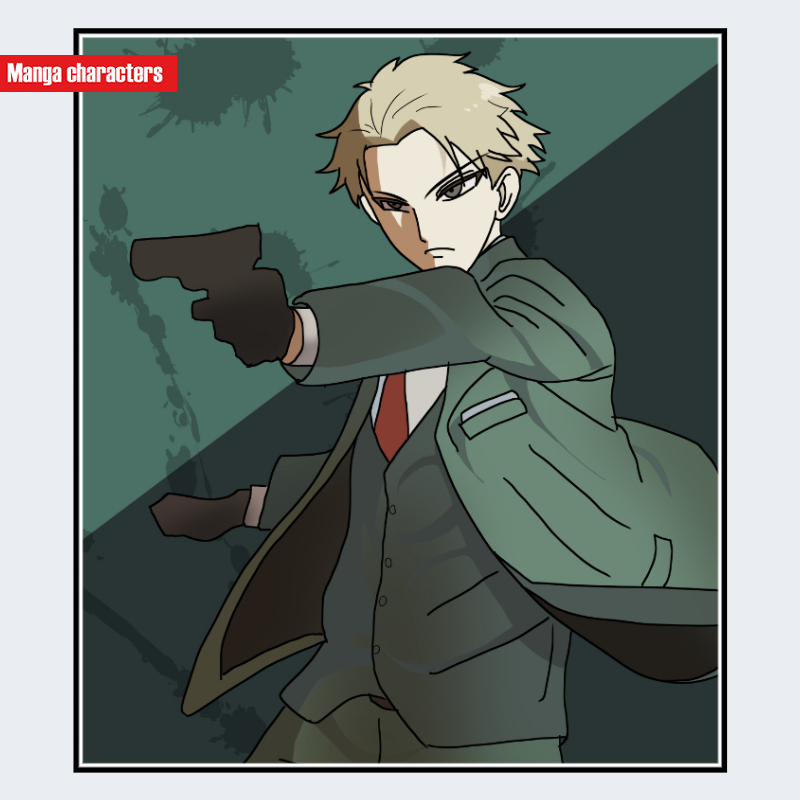 『SPY×FAMILY』に登場するロイド・フォージャーは、短く整えられた金髪と、額に向かって流れる前髪が特徴で、全体としてシャープな輪郭を形成している。上半身の可視範囲では、緑系のロングコートの下にスーツを着用し、赤いネクタイが差し色として配置されている。手には黒い手袋を着用しており、衣装の直線的パーツが動きを強調する視覚構成となっている。髪型はシンプルだが衣装情報が多く、「制服融合型」あるいは「衣装主体型」に分類できる。同作のヨルより装飾が少なく、線密度が抑えられている点に対比的な特徴がある。