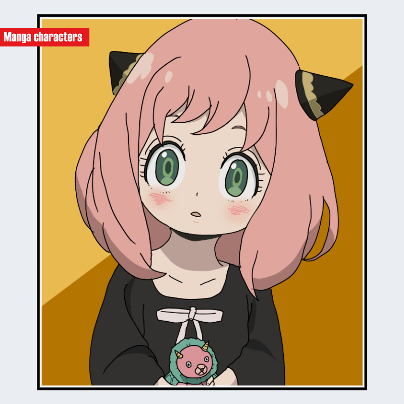 『SPY×FAMILY』に登場するアーニャ・フォージャーは、淡いピンク色の短いボブヘアを持ち、髪先が外側へ軽く跳ねる丸みを帯びたシルエットが特徴である。頭部には左右対称に黒い円錐状の飾りが装着され、金色の縁取りが視覚的なアクセントとして機能している。瞳は大きく緑色で、虹彩の外周に強いラインが入ることで目の存在感が際立つ構造となっている。上半身は黒いワンピース状の衣装で、襟元に白いリボンが配置される「装飾強調型」の衣装構造である。同作のロイドやヨルと比較すると、頭部の装飾デザインが最も情報密度の高い領域になっている。