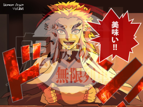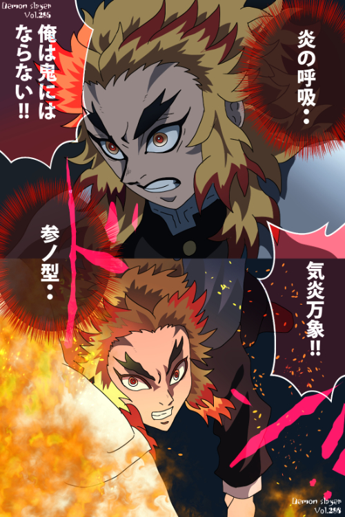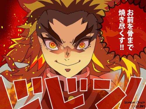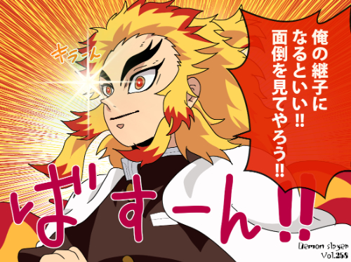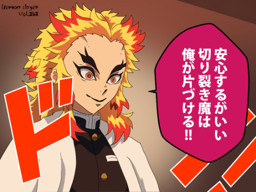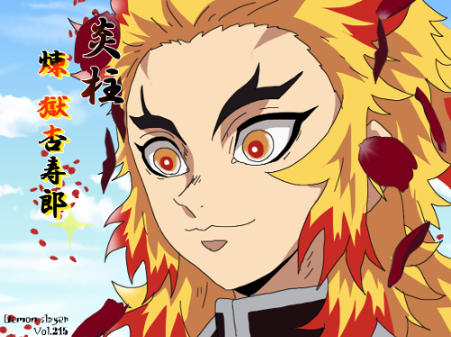『鬼滅の刃』に登場する煉獄杏寿郎は、鮮やかな金髪を基調に、毛先へ向かって赤く燃え上がるような配色が施された髪型が特徴である。髪束は大きく外側へ広がり、炎の形状を思わせる鋭いシルエットが形成されている。太く長い眉は黒色で、目は赤みの強い虹彩を持ち、瞳孔が縦長に描かれた独特の構造が視認できる。上半身は鬼殺隊の隊服を基盤に白い羽織を羽織り、羽織の裾には炎の模様が入る「衣装主体型」のデザインとなっている。同作の他キャラクターと比較しても、髪色と羽織模様の双方が強い要素を持ち、視覚的中心点が明確に設定されている。