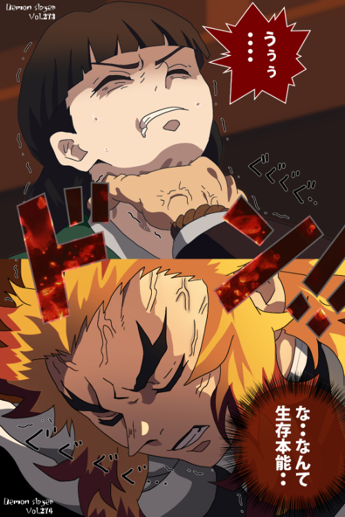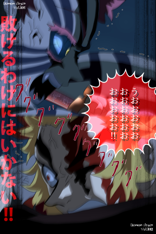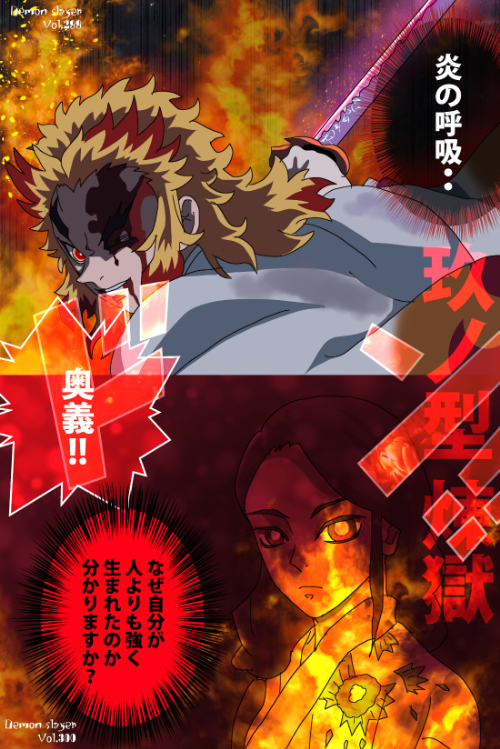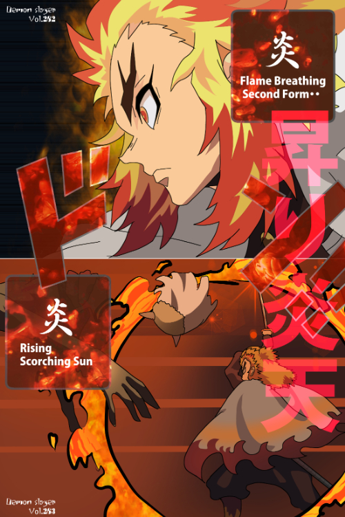“flame-like hair”は抽象的な表現になりやすいため、金から赤へのグラデーション構造と外向きの鋭い毛束を併記すると誤訳を避けられる。眉に関して“thick black eyebrows”とだけ記述すると誇張的な印象を与えるため、形状の長さと太さを中立的に説明する必要がある。羽織の炎模様は“flame-patterned haori”と訳す際、色の連続性を補足すると正確性が上がる。