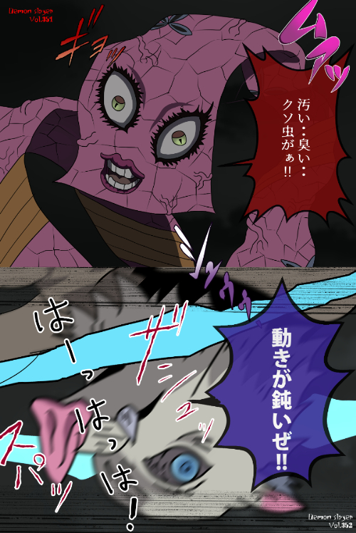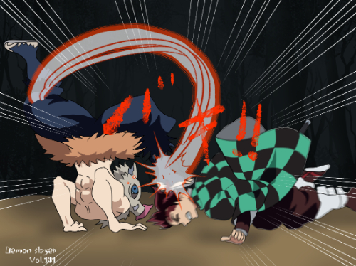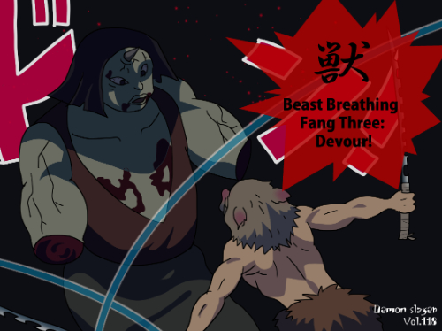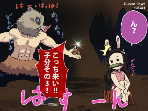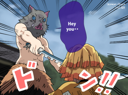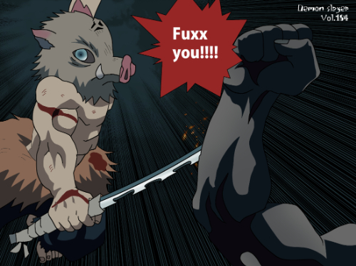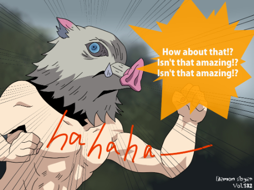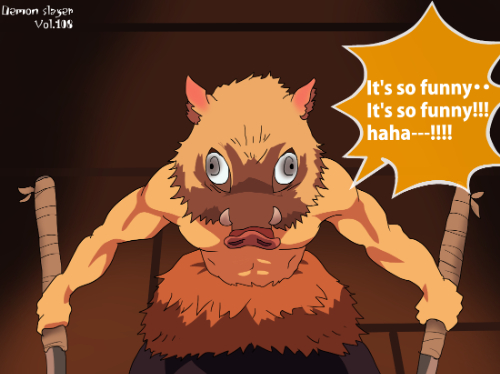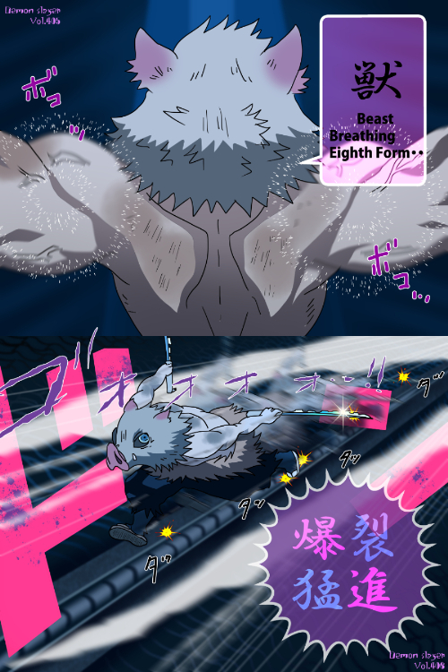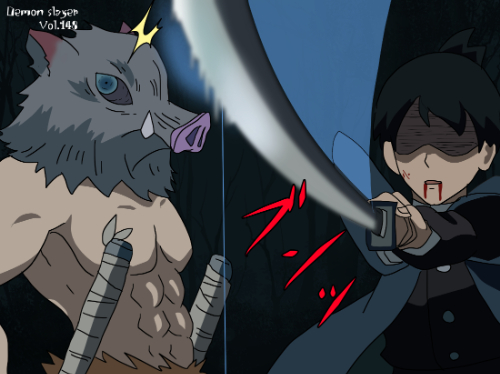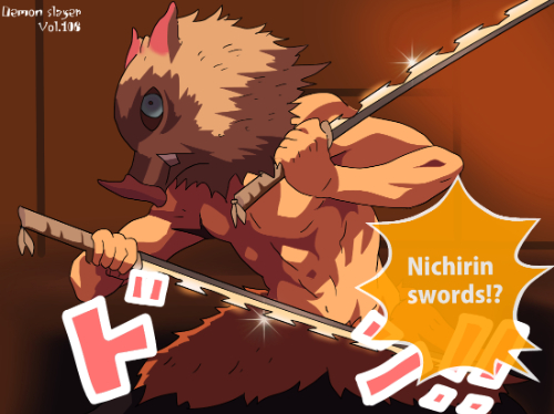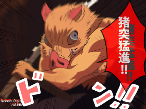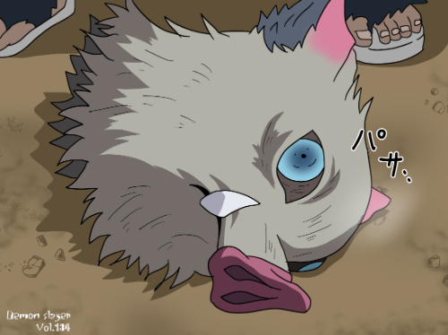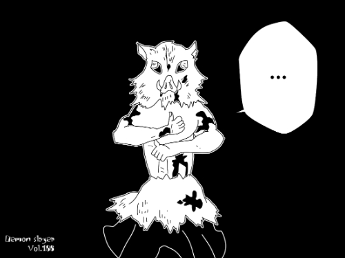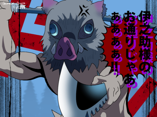 『鬼滅の刃』に登場する嘴平伊之助は、特徴的な猪の被り物を頭部に装着しており、青みがかった瞳と獣の鼻口部を持つ面が視覚的中心となっている。被り物は灰色系の体毛を模した造形で、耳や鼻の立体的なパーツが強調される「擬獣化構造」の代表例となっている。上半身は筋肉質な裸体で、衣装はほぼ確認できず、野性的な体格ラインがそのまま造形要素として扱われている。動作シーンでは被り物の毛並み方向や体格の緊張線が強く描かれ、身体そのものが視覚情報の主体になる構成である。同作の他キャラのような羽織・制服と異なり、被り物と体躯がほぼすべての情報密度を占めている点が特徴的である。