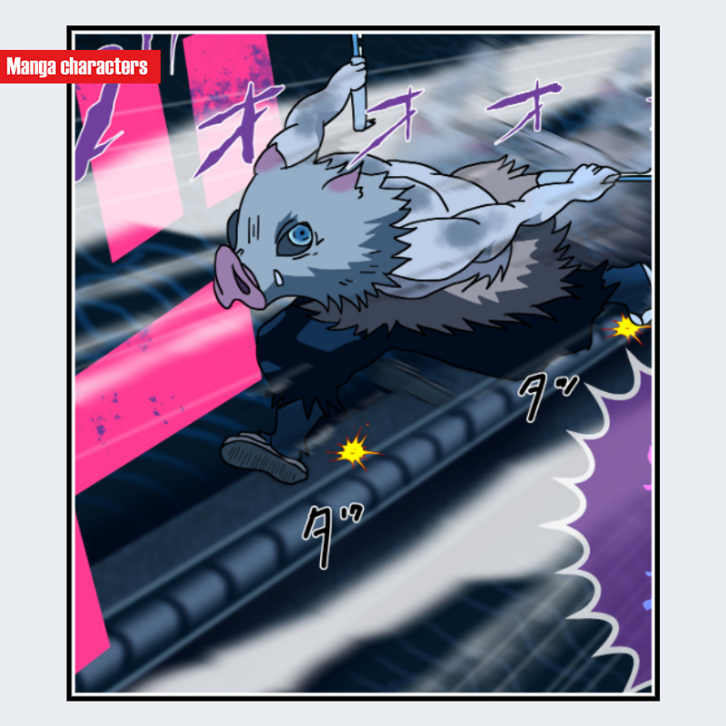 『鬼滅の刃』に登場する嘴平伊之助は、特徴的な猪の被り物を頭部に装着しており、青みがかった瞳と獣の鼻口部を持つ面が視覚的中心となっている。被り物は灰色系の体毛を模した造形で、耳や鼻の立体的なパーツが強調される「擬獣化構造」の代表例となっている。上半身は筋肉質な裸体で、衣装はほぼ確認できず、野性的な体格ラインがそのまま造形要素として扱われている。動作シーンでは被り物の毛並み方向や体格の緊張線が強く描かれ、身体そのものが視覚情報の主体になる構成である。同作の他キャラのような羽織・制服と異なり、被り物と体躯がほぼすべての情報密度を占めている点が特徴的である。
