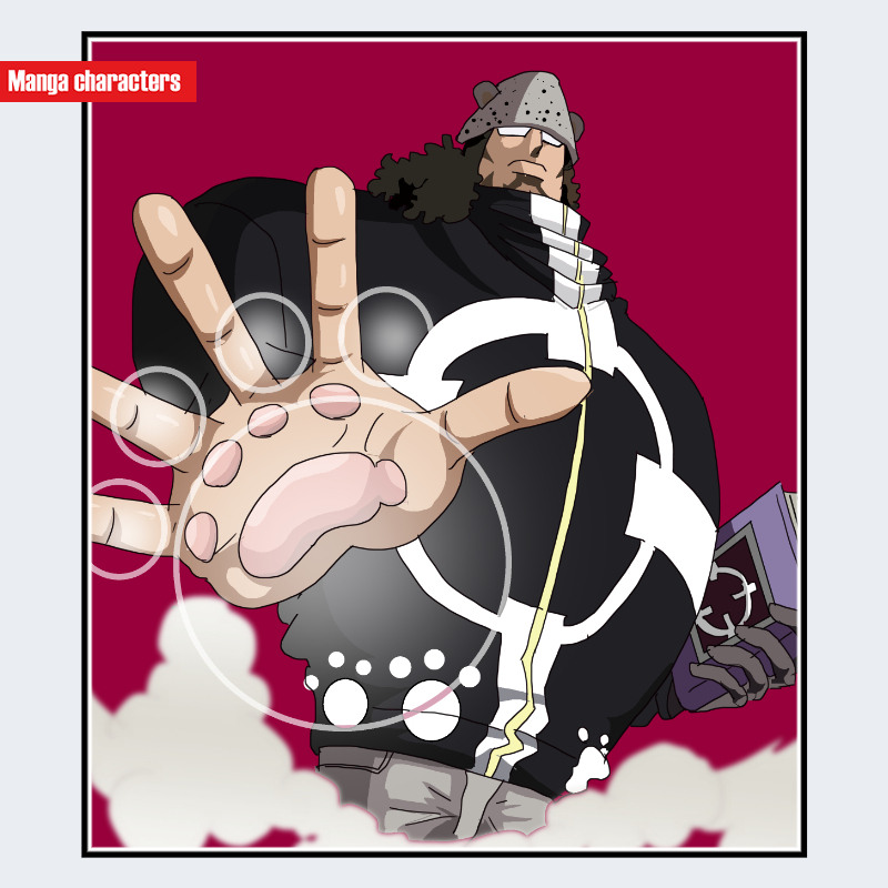 『ONE PIECE』に登場するバーソロミュー・くまは、巨大な体格と丸みを帯びた胴体シルエットを持ち、頭部には金属製の帽子状の装飾を装着している。髪は黒の縮れ毛で左右へ広がり、帽子との境界部分で膨らみを強調する構造となっている。上半身の衣装は黒を基調とし、胸部に大きな白い円状の模様が配置された視覚的に強いデザインで、「衣装主体型」の構造に分類される。手のひらには肉球状のパッドがあり、接触面の楕円形パーツが複数並ぶ独特の造形が確認できる。全体として、体格の大きさと衣装のシンボリックな模様が視認上の中心点となっている。