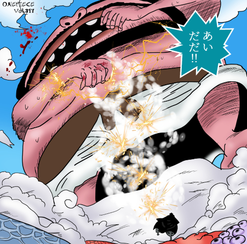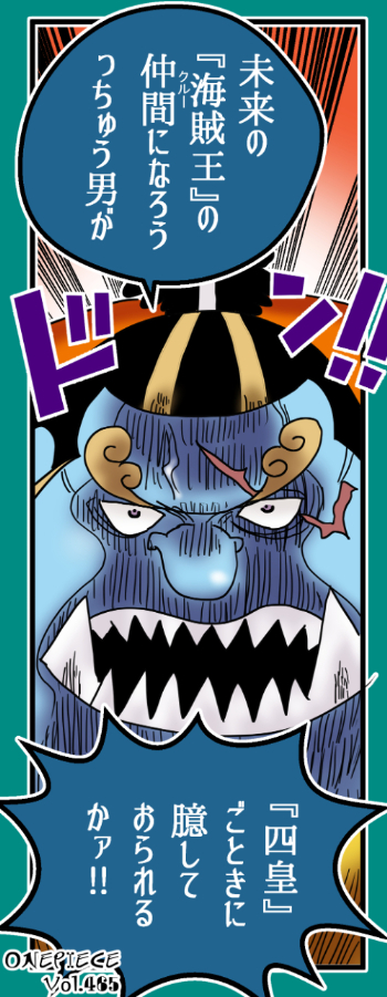 『ONE PIECE』に登場するジンベエは、青い肌と大きな体格を特徴とし、頭部には黒い縮れた髪がまとまり、額部分に帯状の飾りが巻かれている。眉は太く鋭い角度で描かれ、目は黄色系の虹彩と黒い瞳孔の対比によって視線の強さが際立つ構造を持つ。上半身には赤い羽織が確認でき、黒と白の模様が部分的に配置された「衣装主体型」の視覚構造となっている。体格は横幅の広いシルエットで、肩から胸元にかけての大きな面積が造形の主軸となる。同作のドフラミンゴの縦長シルエットとは異なり、ジンベエは横方向に重心を置いた造形が特徴的である。