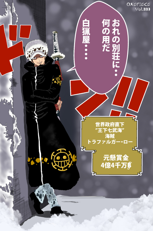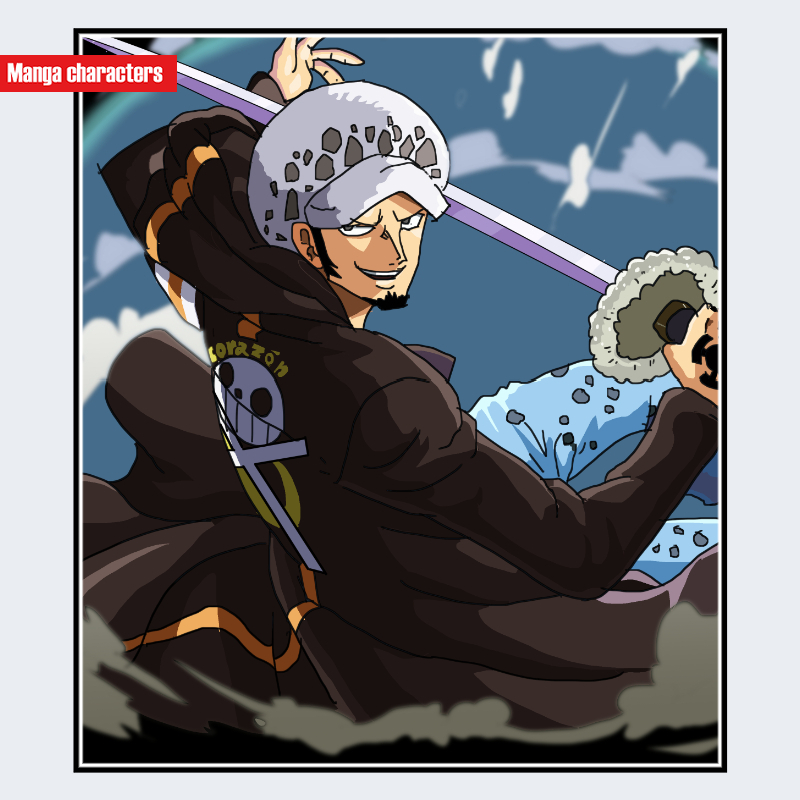 『ONE PIECE』に登場するトラファルガー・ローは、白地に黒い斑点模様が入った帽子を深く被り、側面に見える黒髪は短く整えられている。顎には小さな無精髭が確認でき、顔の輪郭線が強調される造形となっている。上半身の可視範囲では黒いロングパーカーを着用し、背面には大きなシンボルマークが描かれた視覚的に強いデザインを特徴とする。「衣装主体型」の分類が適用され、武器である長刀の柄部分が画面に見えることで縦方向の構図が補強されている。ドフラミンゴの華美な装飾性とは対照的に、ローは黒基調の簡素な衣装と帽子の模様が識別の中心となる。
