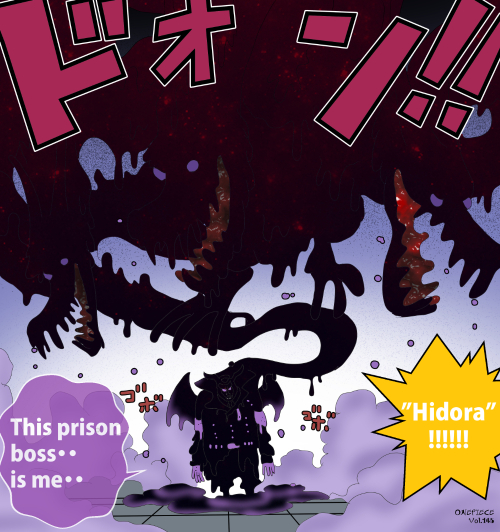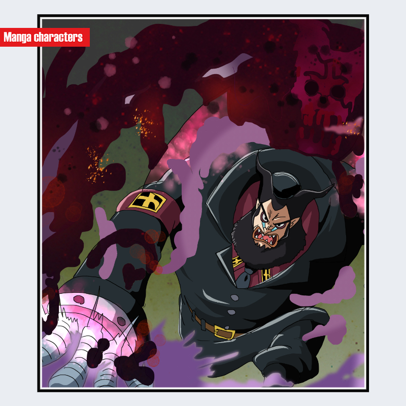 『ONE PIECE』に登場するマゼランは、大きく反り返った二本の角のような髪型と、額から後頭部へ伸びる黒髪が特徴的である。顔は長い顎ひげと鋭い牙状の歯が目立ち、表情線が深く刻まれた造形となっている。上半身は黒を基調とした軍服風の衣装で、肩や胸部に紫色の意匠が入り、袖には十字章のようなマークが配置された「制服融合型」の構造が確認できる。体格は非常に大柄で、肩幅が広く、衣装の直線的なラインが力強い輪郭を形成している。背後に描かれた紫の液体表現はあくまで背景の視覚要素であり、構造要素ではない。