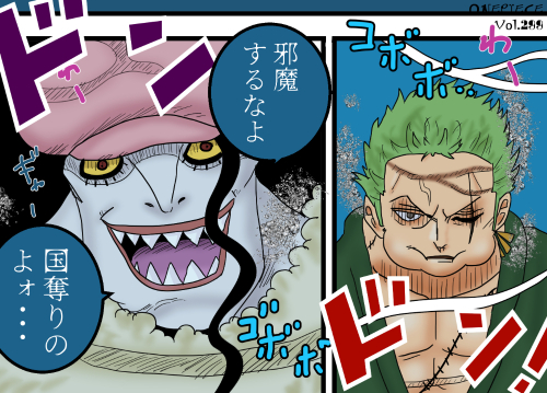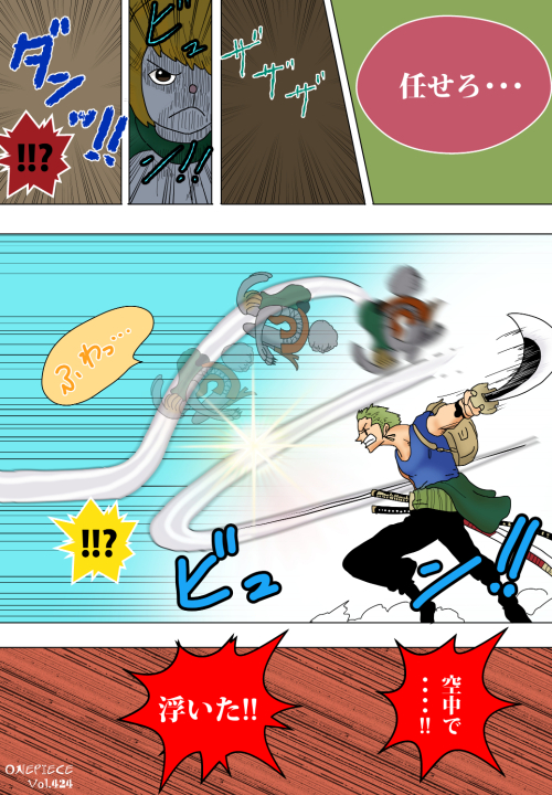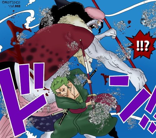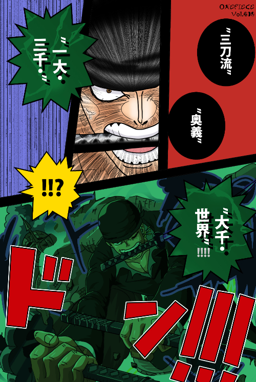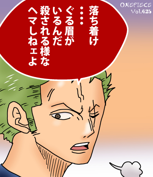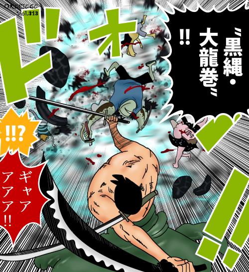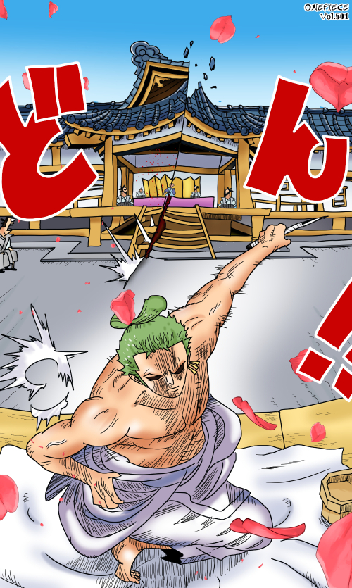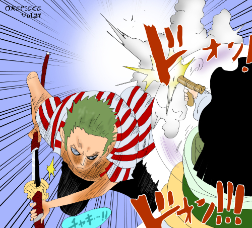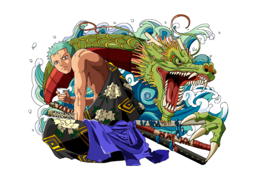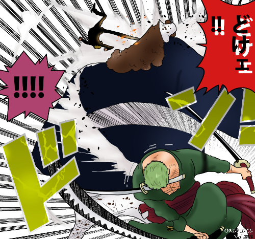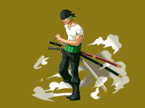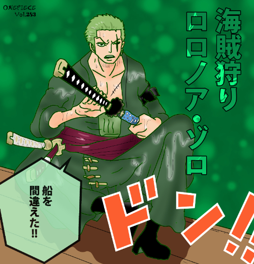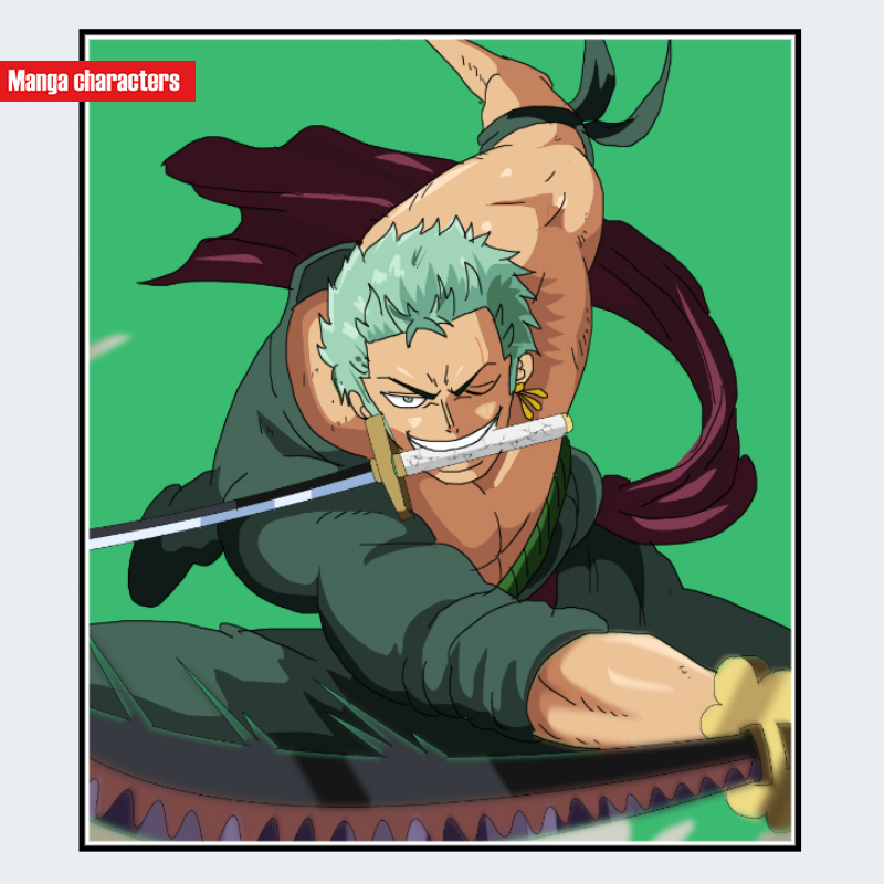 『ONE PIECE』に登場するロロノア・ゾロは、短く刈り込まれた緑色の髪と、鋭い目元の線構成が特徴である。髪は全体的に均一な長さで、頭部の丸みをそのまま強調するシルエットを形成している。上半身は前を大きく開いた緑の和装風衣装で、腰帯に複数の刀を装備する構造が視認できる。口には刀を咥える描写があり、三本の刀を扱う構造が外観上の識別点となる「装備主体型」の構造といえる。同作のサンジのようなスーツ系の直線的衣装とは異なり、ゾロは布の重なりと刀装備による独特の重量感が視覚中心を構成している。