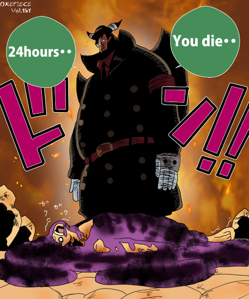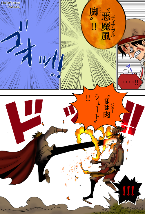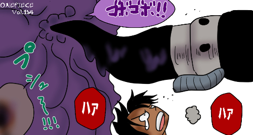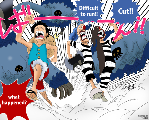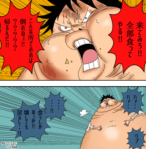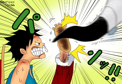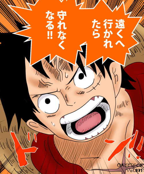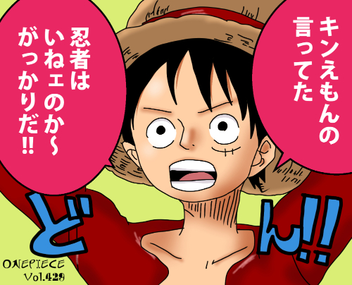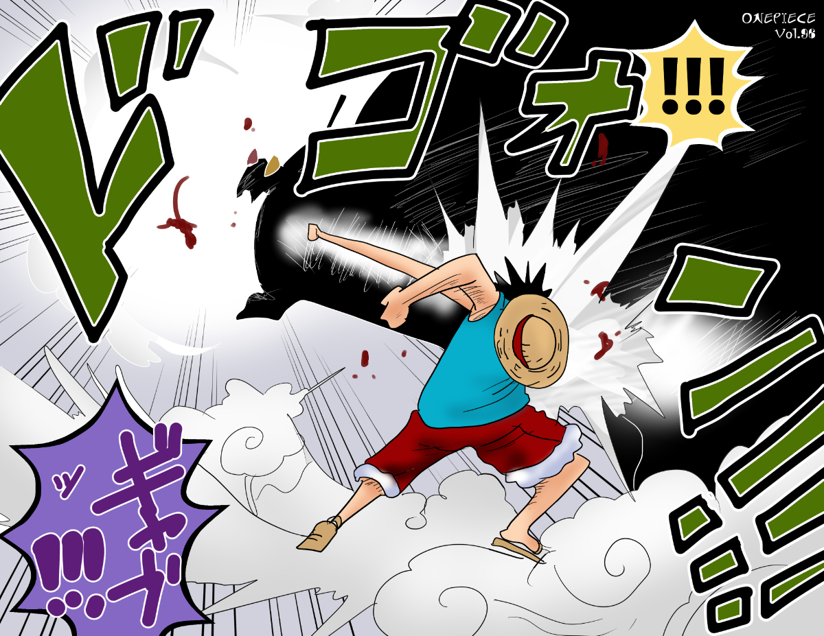 『ONE PIECE』に登場するモンキー・D・ルフィは、短く跳ねた黒髪と大きく開いた目が特徴で、顔の輪郭はシンプルな線構成で描かれている。上半身は赤い襟なしジャケットを羽織り、前を大きく開いているため腹部の筋肉ラインが露出する構造となっている。腰には黄色の帯状の布を巻き、衣装の色面が三色で明確に分離された「衣装主体型」の視覚構成である。体格は細身ながらも腕や胴の伸ばし動作が強調される描線があり、動きの軌跡がシルエットの一部として扱われる。同作のゾロやサンジと比較すると、ルフィは装飾よりも身体の動作が視覚中心点を担う構造になっている。