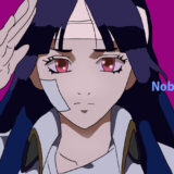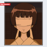 『銀魂』に登場する今井信女は、長い黒髪を後方へ流した造形が基調で、前髪は左右非対称に分かれた直線的カットが特徴です。頭部には包帯が巻かれ、頬にも絆創膏が貼られており、負傷表現が視覚記号として明確に配置されています。上半身の衣装は淡色の襟元を持つ制服系デザインで、肩から胸部にかけては硬質感の少ない布構造が見られます。全体として「制服融合型」かつ「負傷記号構造」を持つキャラクターで、銀魂内の他キャラ(例:神楽の中華系衣装)とは異なる、簡素で直線基調のデザインが際立っています。