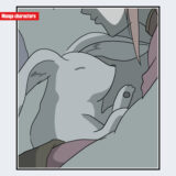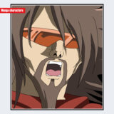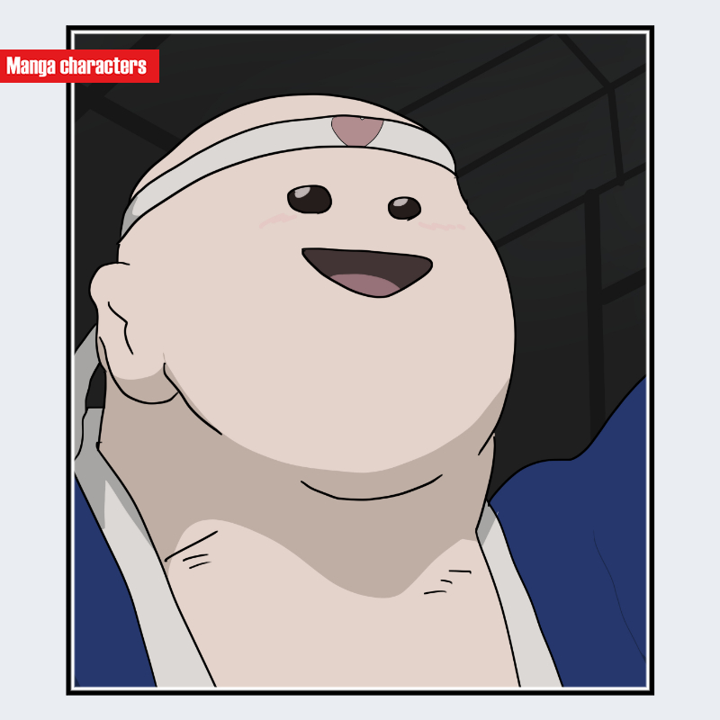 『銀魂』に登場する寺門通 親衛隊隊員No.49は、全体的に丸みを帯びた頭部と体格を持ち、特徴的なのっぺりとした顔面構造が確認できる。額には小さなハート形のマークがあり、白い鉢巻きによって頭部上部が覆われている。目は点状で簡略化され、口は横長のシンプルな造形で、記号的な表現が強いデザインである。衣装は青を基調とした上衣と白いインナーを組み合わせており、同作のシンプル造形キャラ群と同系統の「記号化強調型」に分類される。