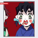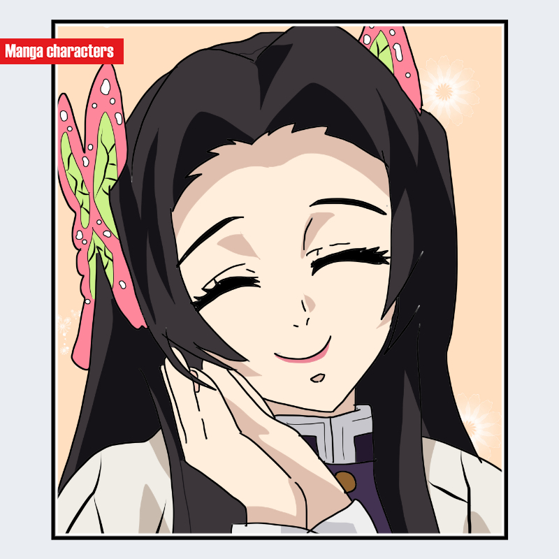 『鬼滅の刃』に登場する胡蝶カナエは、肩まで伸びる黒髪を左右対称に整え、蝶を模した大きな髪飾りを頭部側面に配置しているのが視覚的特徴である。髪飾りは淡いピンク基調に緑色の模様が入り、羽根状の形状を強調している。上半身は白を基調とした隊服と羽織の境界が確認でき、襟元には直線的な構造が見える。全体として「制服融合型」の構造を取り、同作品の胡蝶しのぶと共通する意匠を保持しつつも、柔和な線の配置によって差異が明確化されている。