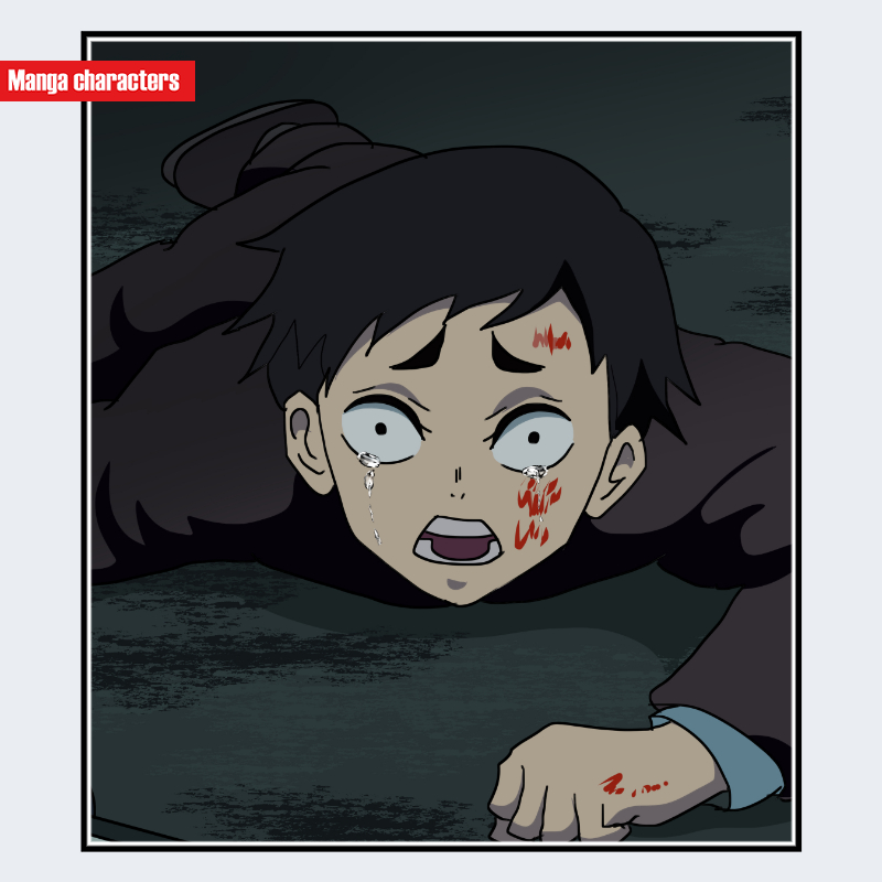 『鬼滅の刃』に登場する鬼殺隊先輩隊士は、短く整えられた黒髪と若年層特有の小柄な顔立ちが確認できる人物である。上半身は濃色の衣装を着用しており、隊服系の直線的な襟構造が一部見える。顔面および腕部には擦過痕のような赤い傷跡が複数描かれ、涙の描写と相まって表情の緊張度を構造的に示している。全体として「制服融合型」の衣装構造を取り、同作品内の一般的な民間人とは衣服の線形と濃色配色で明確に差別化されている。