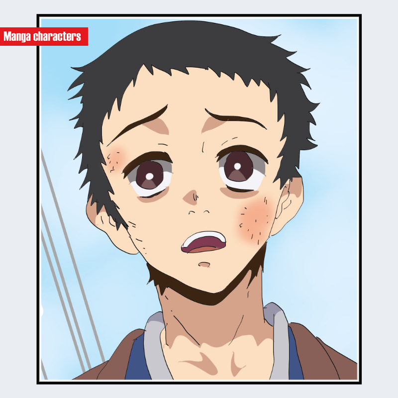 『鬼滅の刃』に登場する和己は、短く刈り込まれた黒髪と丸みを帯びた顔立ちが特徴である。頬には小さな擦過痕が複数描かれ、肌のトーンはやや赤みを帯びている。眼は大きく、瞳孔の周囲が淡色で縁取られた構造を持つ。衣装は襟付きの上衣と外衣が重なった二層構造で、肩周辺の布の折れ目が明確に確認できる。全体として「日常衣装型」の構造で、隊服系の直線的デザインを持つキャラとは衣服線の柔らかさで区別されている。