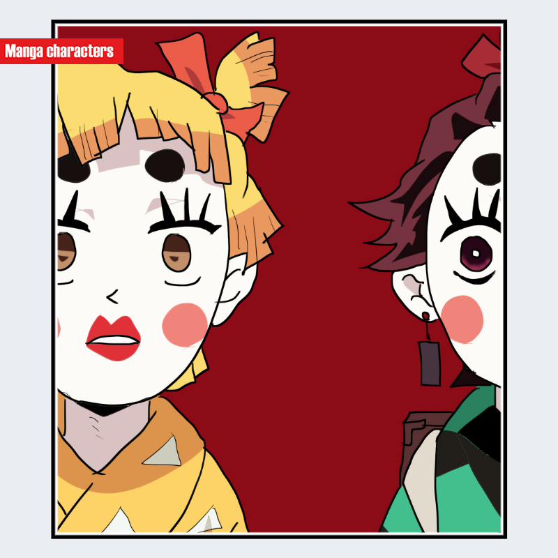 『鬼滅の刃』に登場する善子(善逸の変装形態)は、金髪の断片的な束感を残した髪型に、白塗りの顔と強調されたまつげ・頬紅・唇の装飾が加えられた化粧構造を持つ。髪色や前髪の形状は善逸本来の特徴を踏襲しており、変装時でも原型の識別要素が残っている。衣装は見える範囲で淡い色の着物風の襟が確認でき、炭子・猪子と同系列の「化粧付加型」構造に属する。炭子と比較すると、善子は髪の形状と色の原型保持率が高く、視覚的な変装ポイントが主に顔面装飾に集中している。
