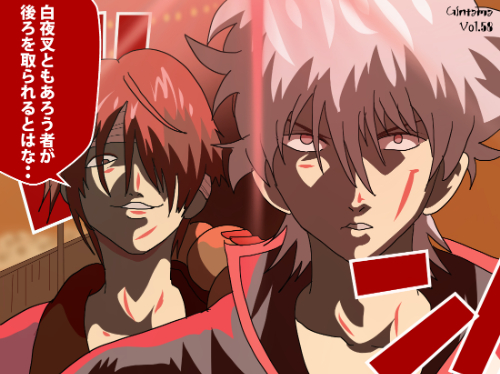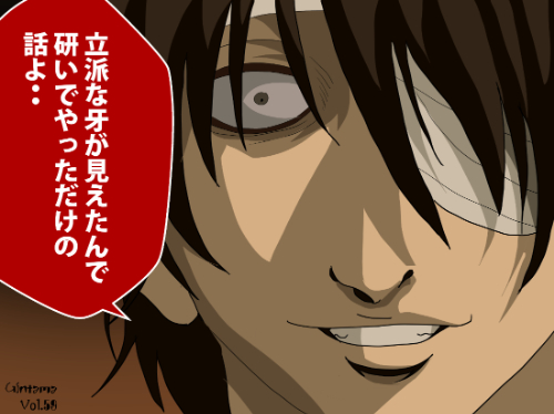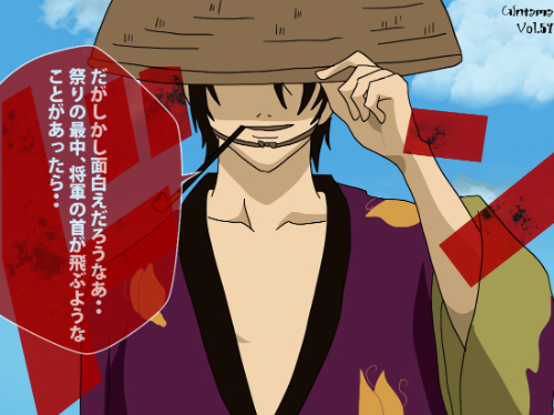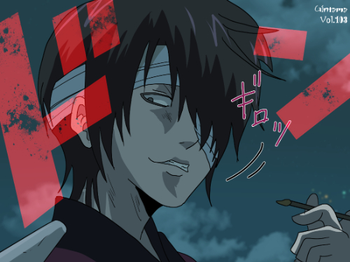 『銀魂』に登場する高杉 晋助は、暗色のショートレイヤーを基調とし、額に巻かれた白い包帯が前髪束の根元を押さえる「包帯固定型」の髪構造を持つ。側頭部から頬に落ちる髪束は鋭角に分かれ、顔の縦方向のラインを強調する配置となっている。横顔は濃い影線で大きく覆われ、頬・顎・首元にかけて面が強く分割される「影線強調型」の描線が特徴である。衣装は視認範囲で黒系の上衣が確認でき、襟元に直線的な装飾が入る単層布構造となっている。