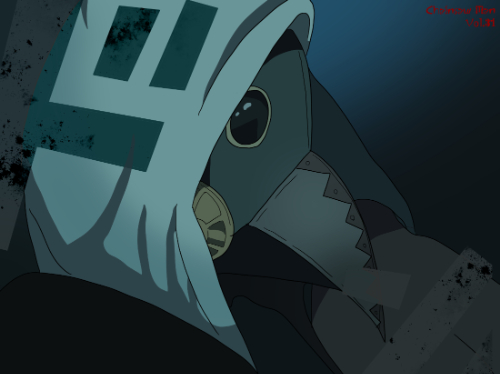 『チェンソーマン』に登場するガルガリ(暴力の魔人)は、嘴状のマスクと縫製ラインが強調された頭部装甲を持つキャラクターである。フードのように頭部全体を覆う外殻には、円形の視界孔とメッシュ状パターンが配置され、鳥類的造形を思わせる擬獣化構造が用いられている。嘴部分は鋸刃状の稜線が刻まれた硬質パーツで構成され、上下の段差による機械的意匠が確認できる。全体として、顔全体を覆う仮面型デザインが中心で、同作内の人型キャラと比較して外装比率が非常に高い。