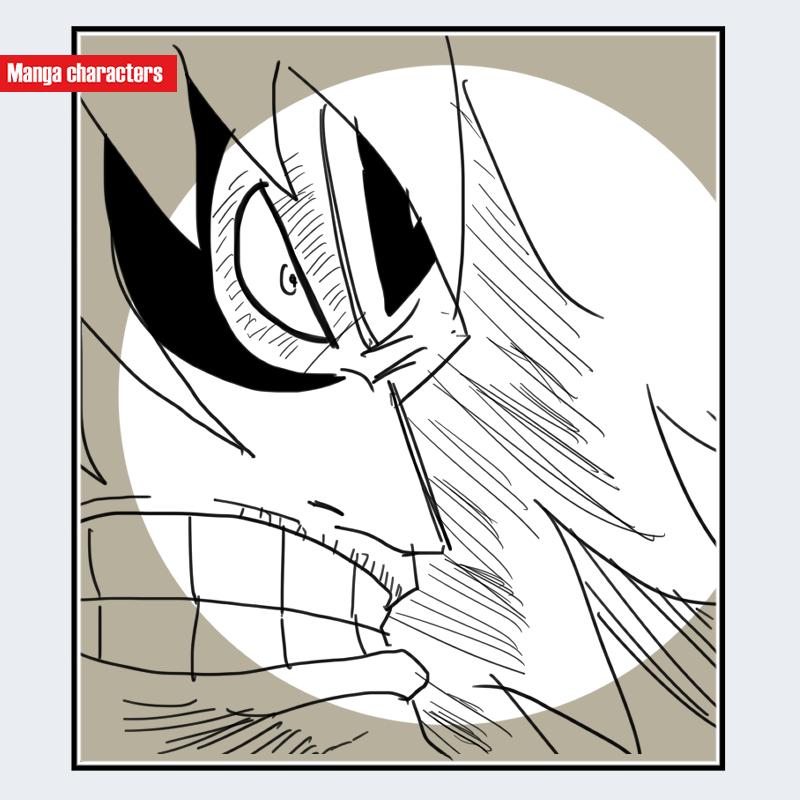 『ONE PIECE』に登場するカルガラは、目元に深い影が入る鋭い描線と、頬から顎にかけて強い角度をもつ輪郭が特徴的な「硬質化構造」の顔面造形を持つ。鼻梁は直線的に下り、口元は大きく開いた横方向の広がりが強調されている。眉は太く斜めに切れ込み、額から頬まで連続する線が力強いシルエットを形成する。髪は長く後方へ流れる描写で、縦方向の動きが顔の水平線の強さと対比している。同作品内では、直線主体の強固な顎輪郭をもつキャラとして識別しやすい。